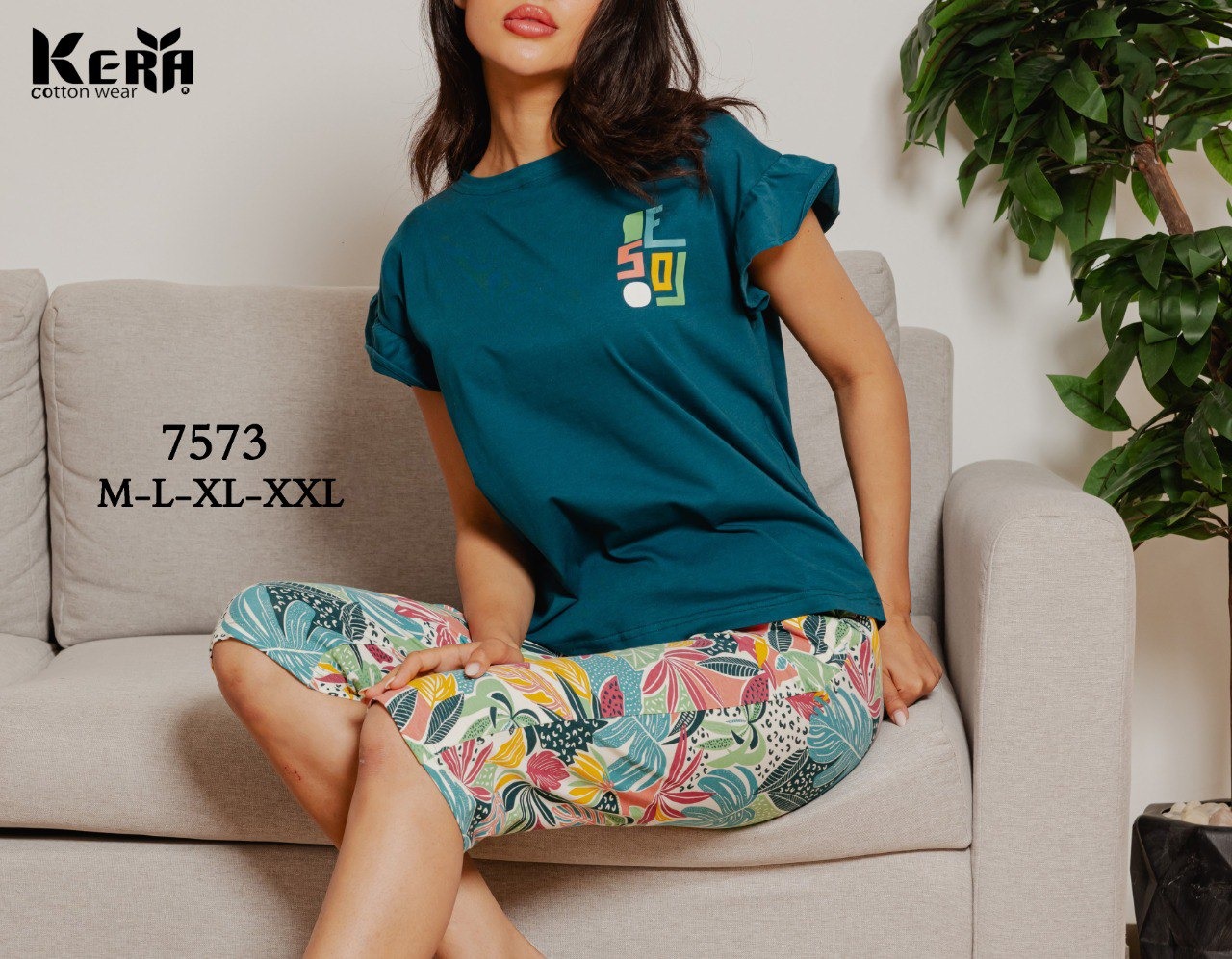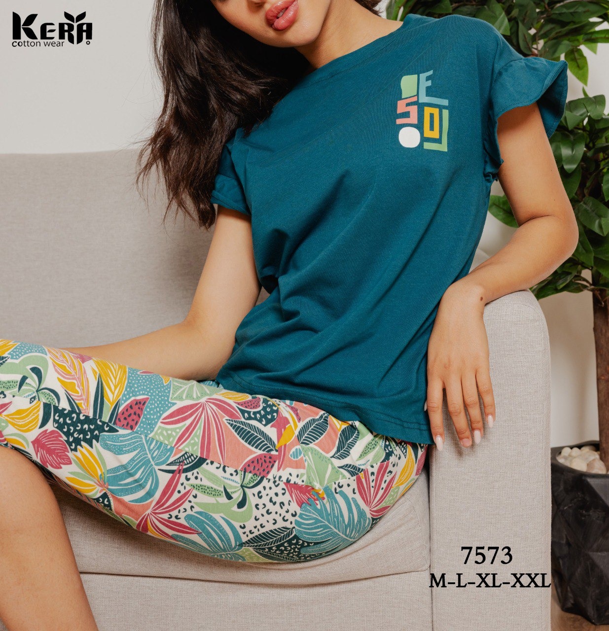 بيجاما حريمي قطن بنتاكور مطبوعة أوراق مبهجة من كيرا 7573 | Pyjamty