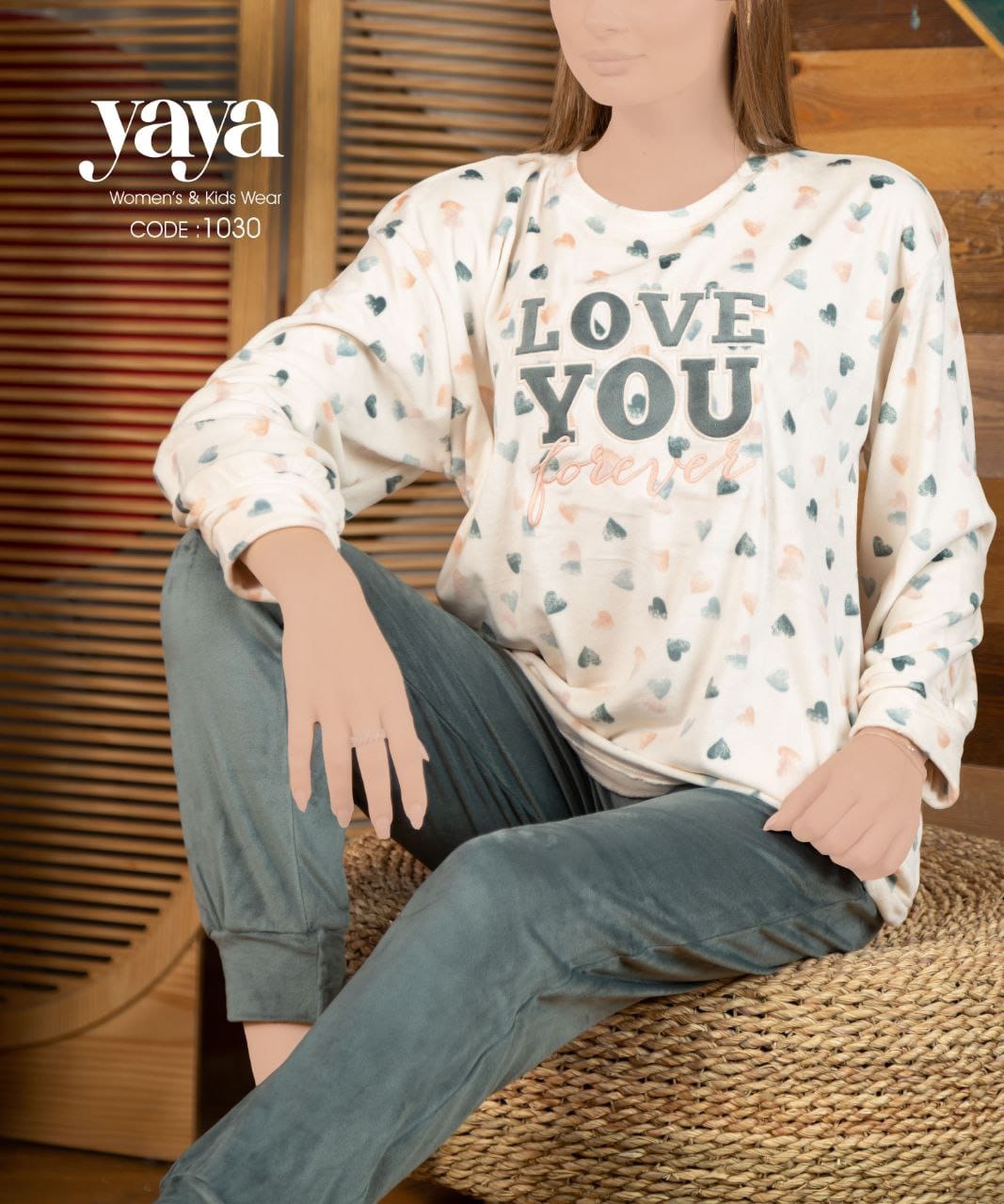 بيجامة شتوي قطيفة بلون زيتي مميز من يايا 1030 Hearts | Pyjamty