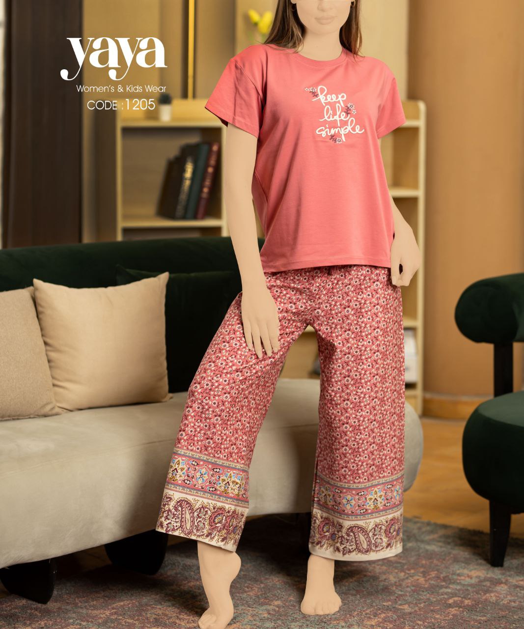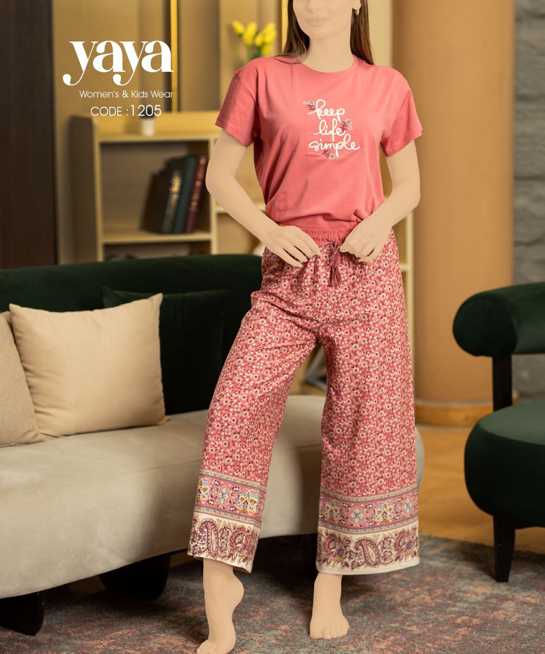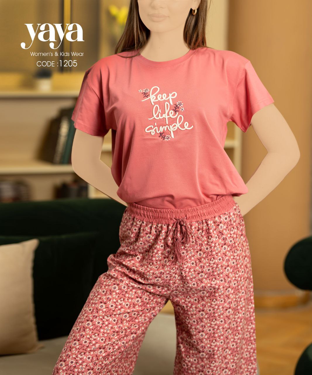 - بيجامة صيفي قطن ببنطلون منقوش واسع من يايا 1205
