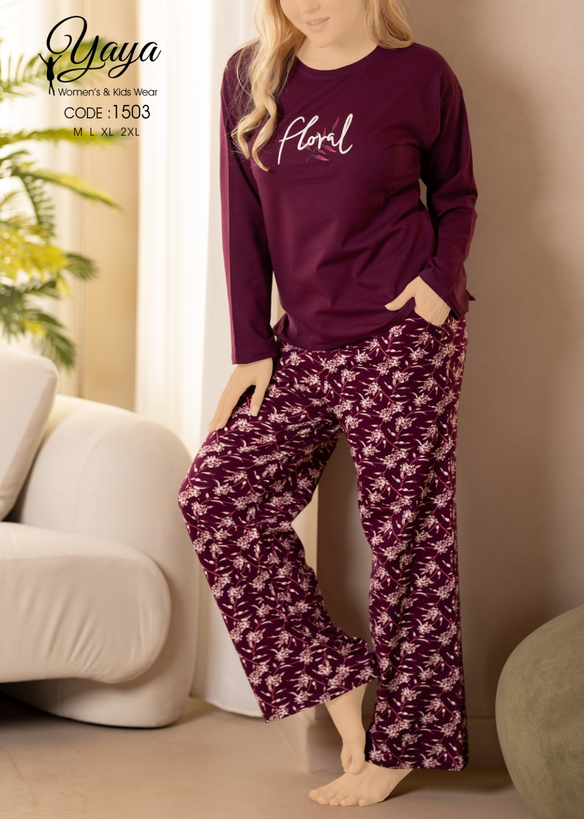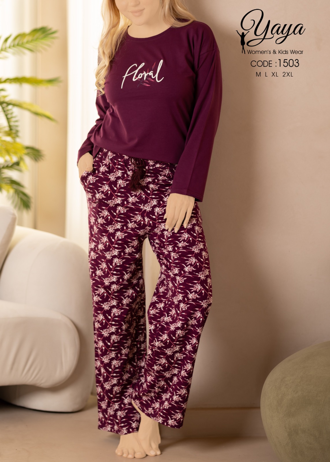 long sleeve cotton pajama with a floral print in a burgundy color from yaya 1503 Floral | Pyjamty
