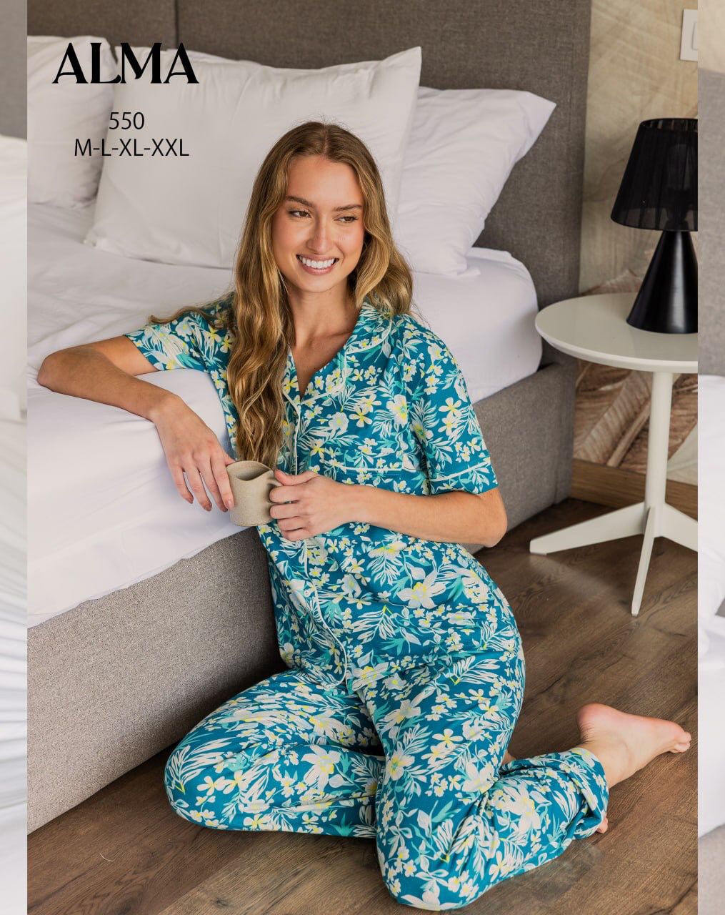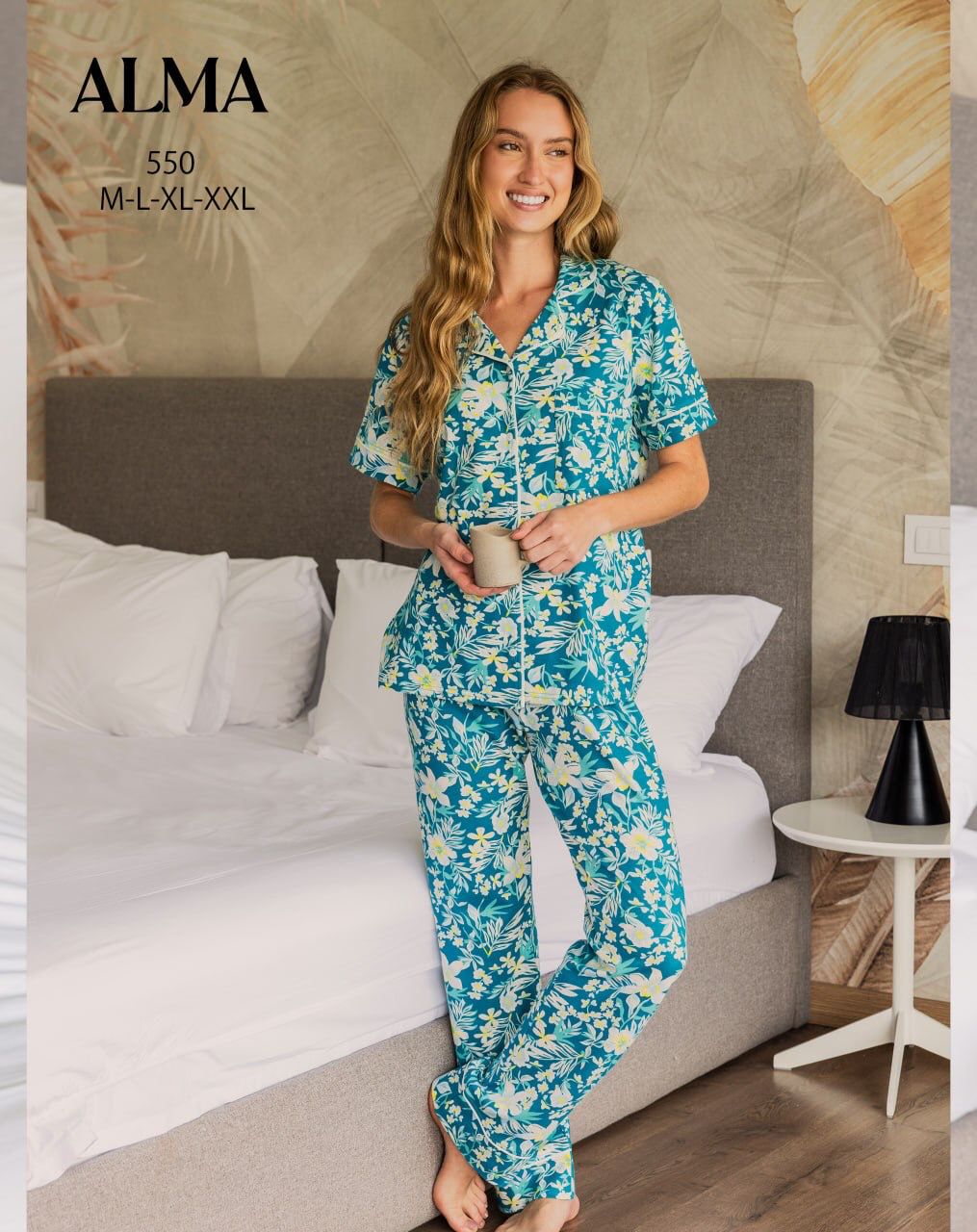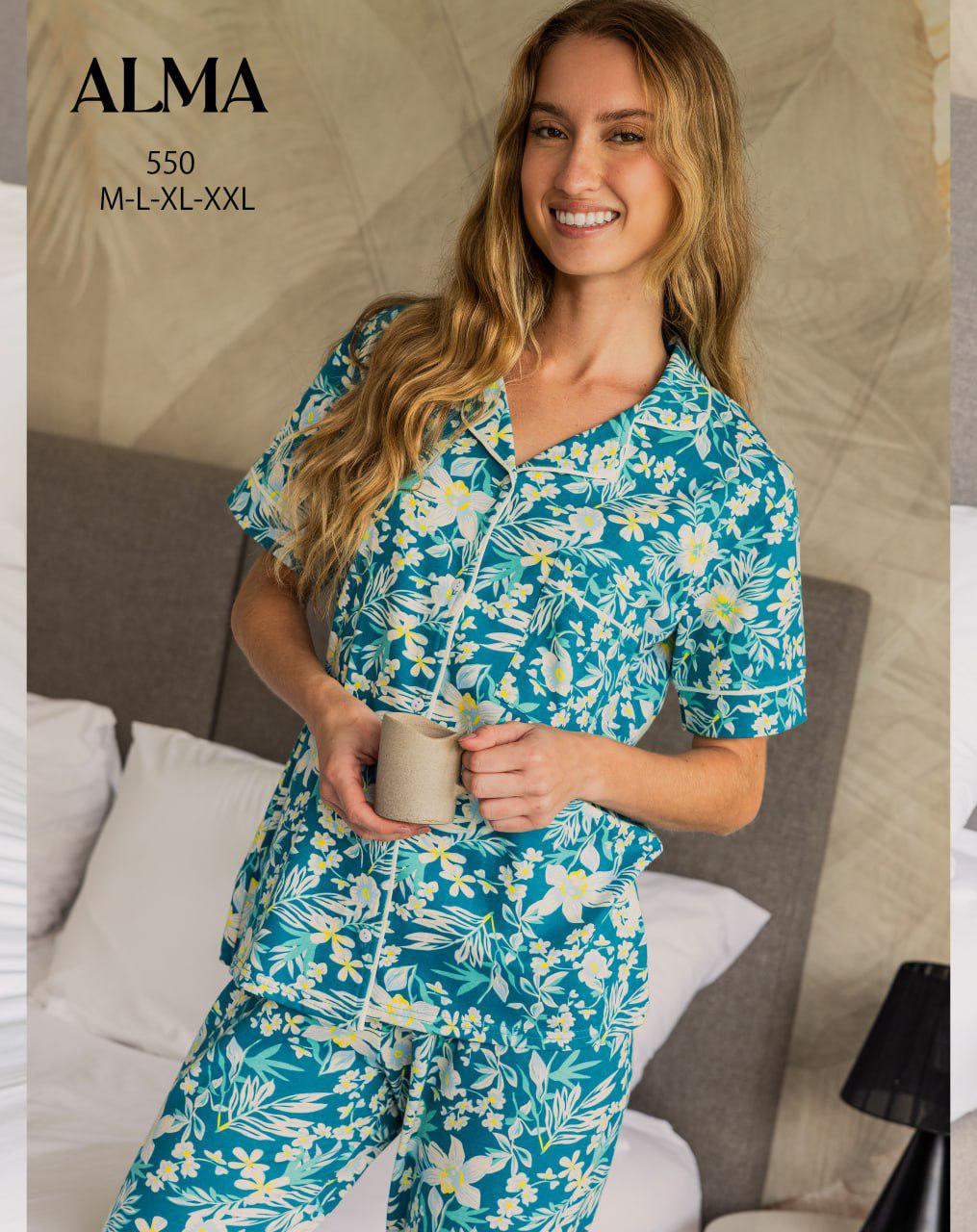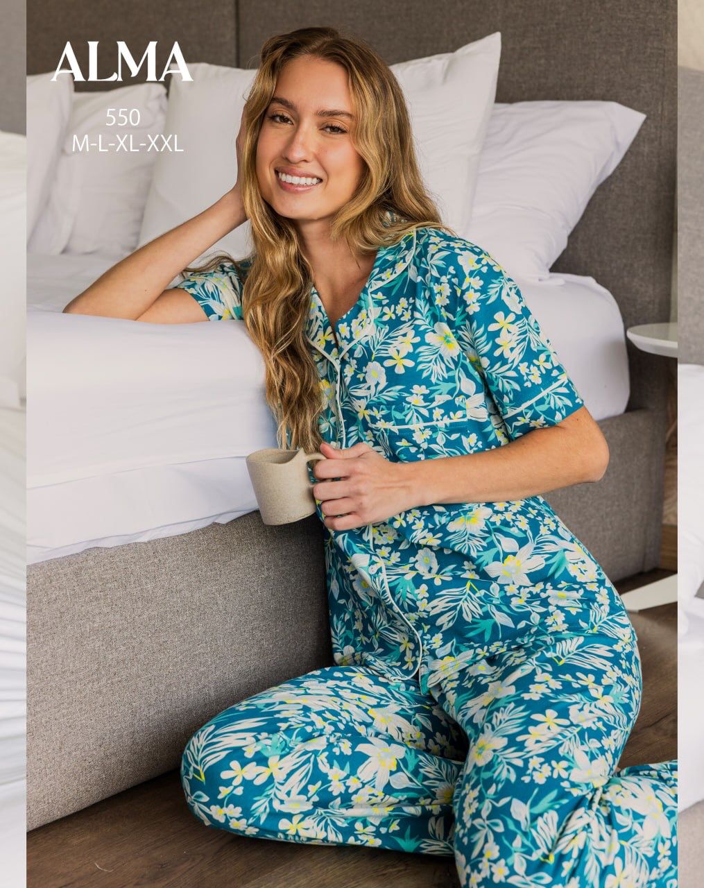 short-sleeve pajama set with a button-up top, featuring a vibrant tropical print from ALMA 550