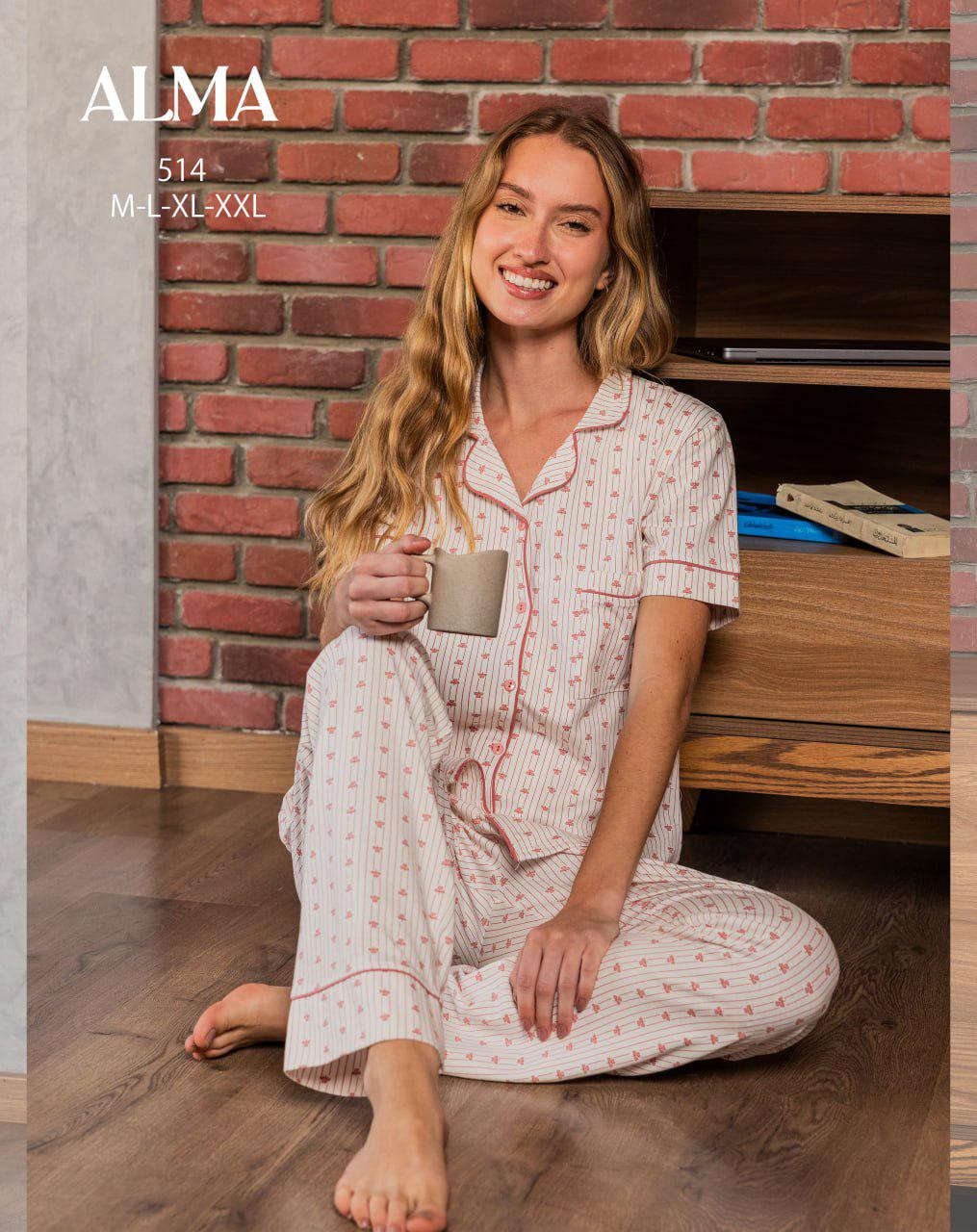 short-sleeve pajama with button-up top, with a stripped print from ALMA 514 | Pyjamty